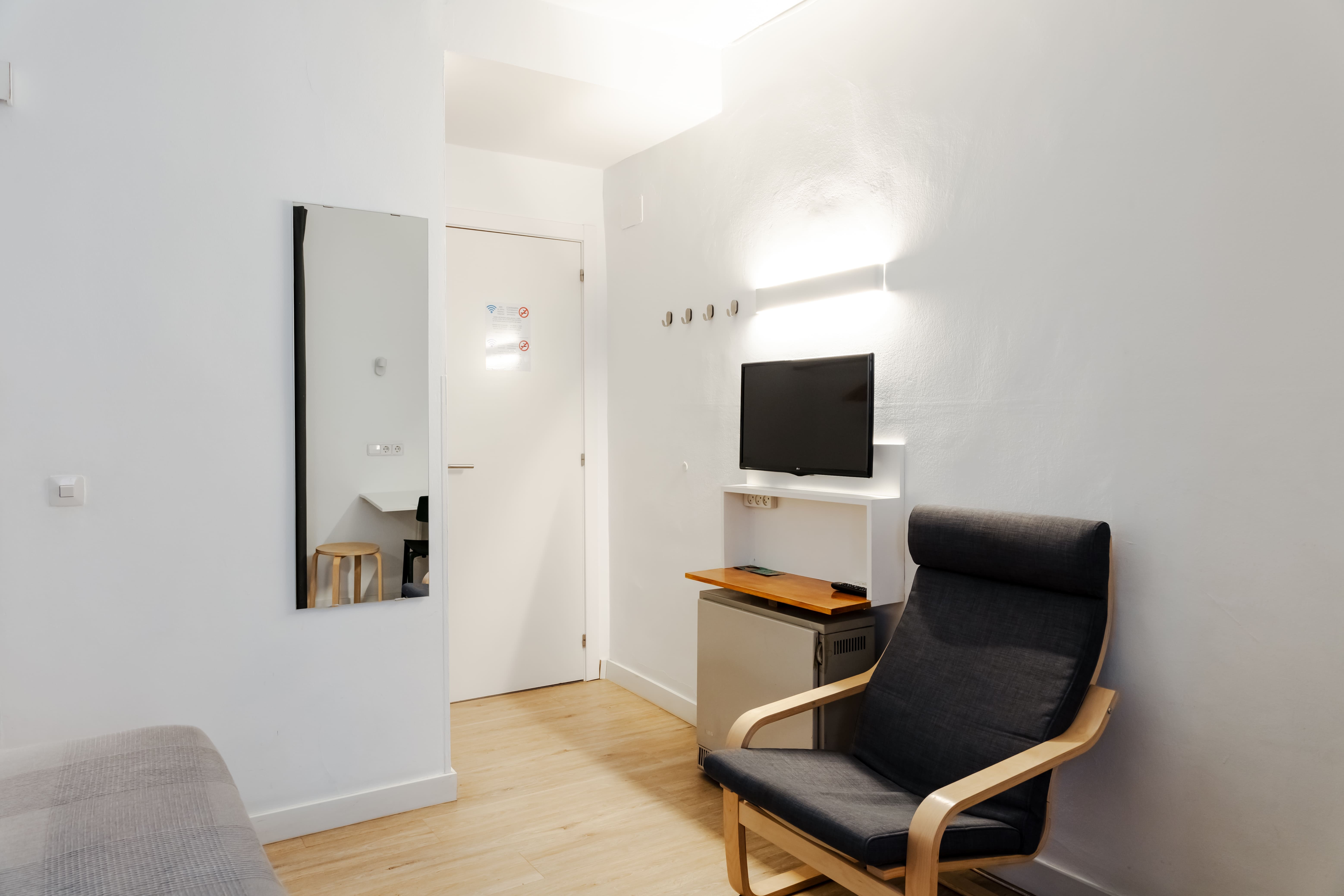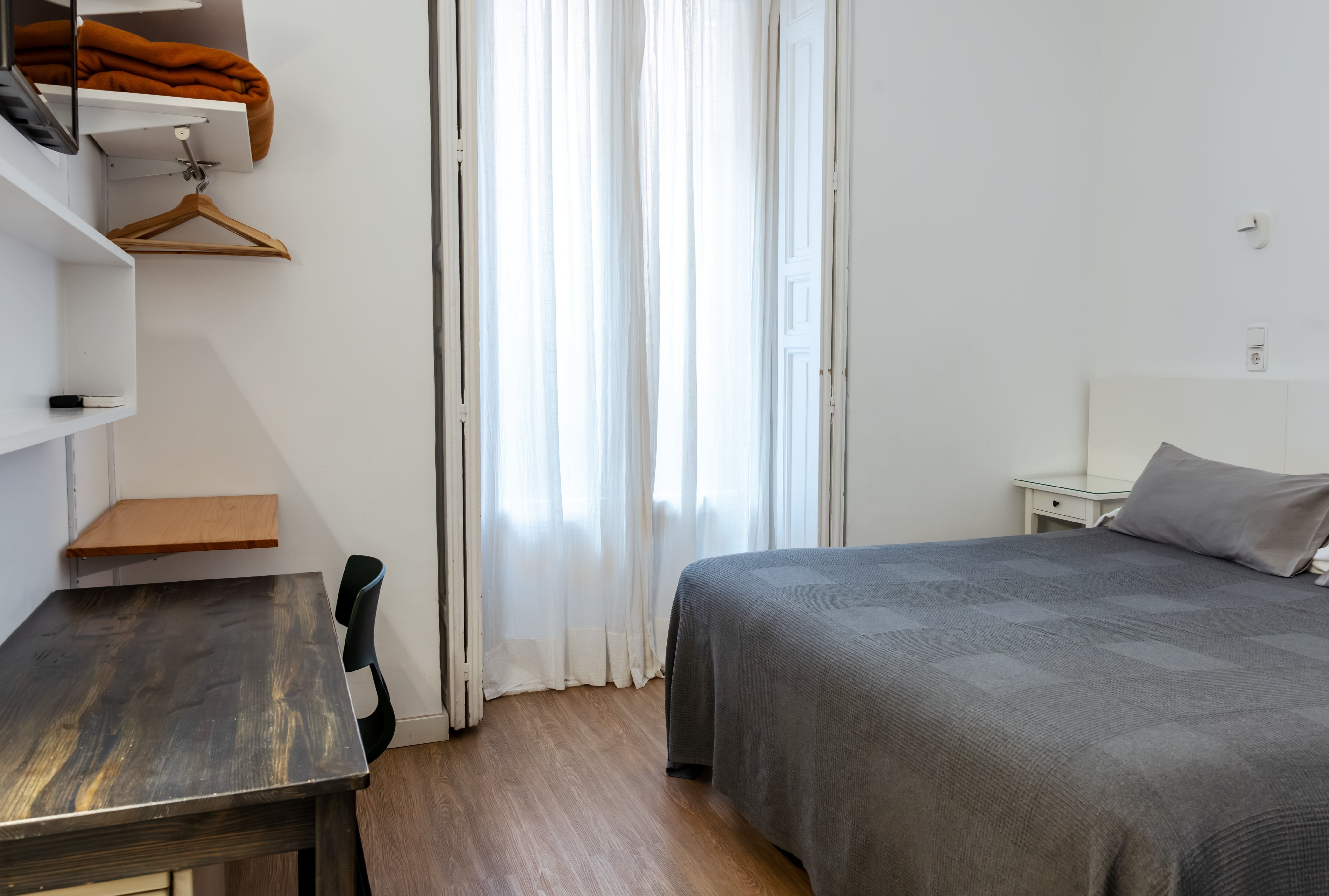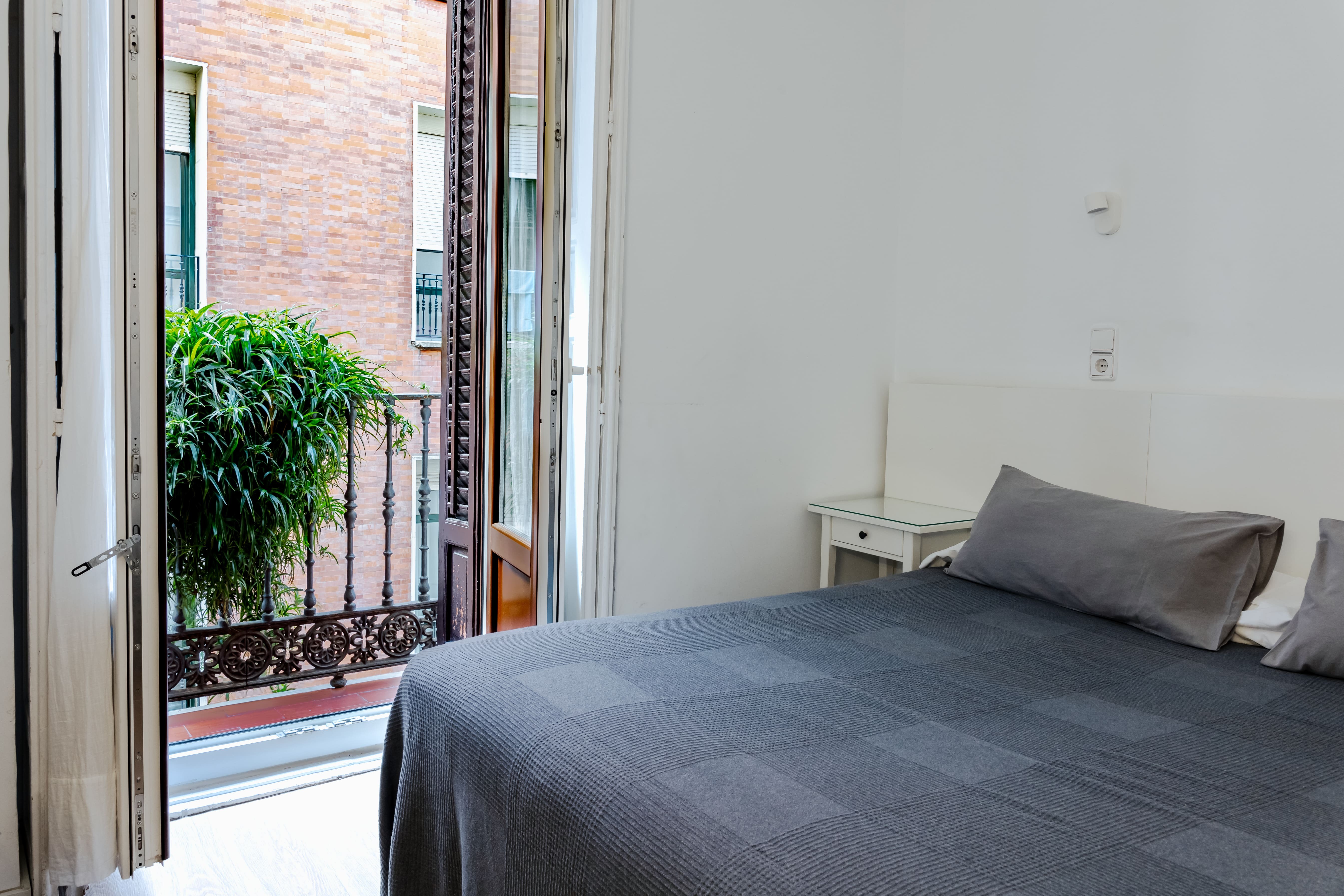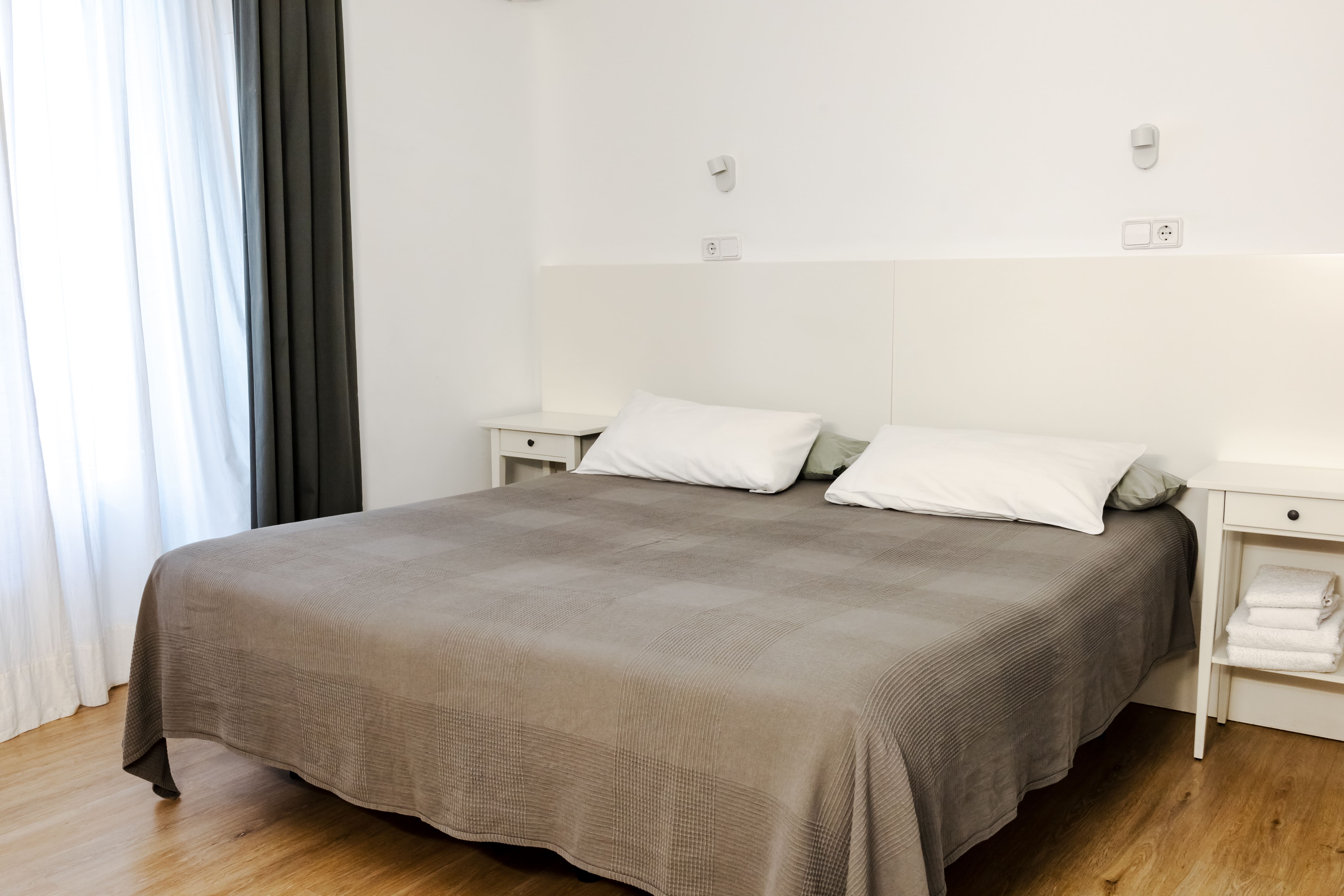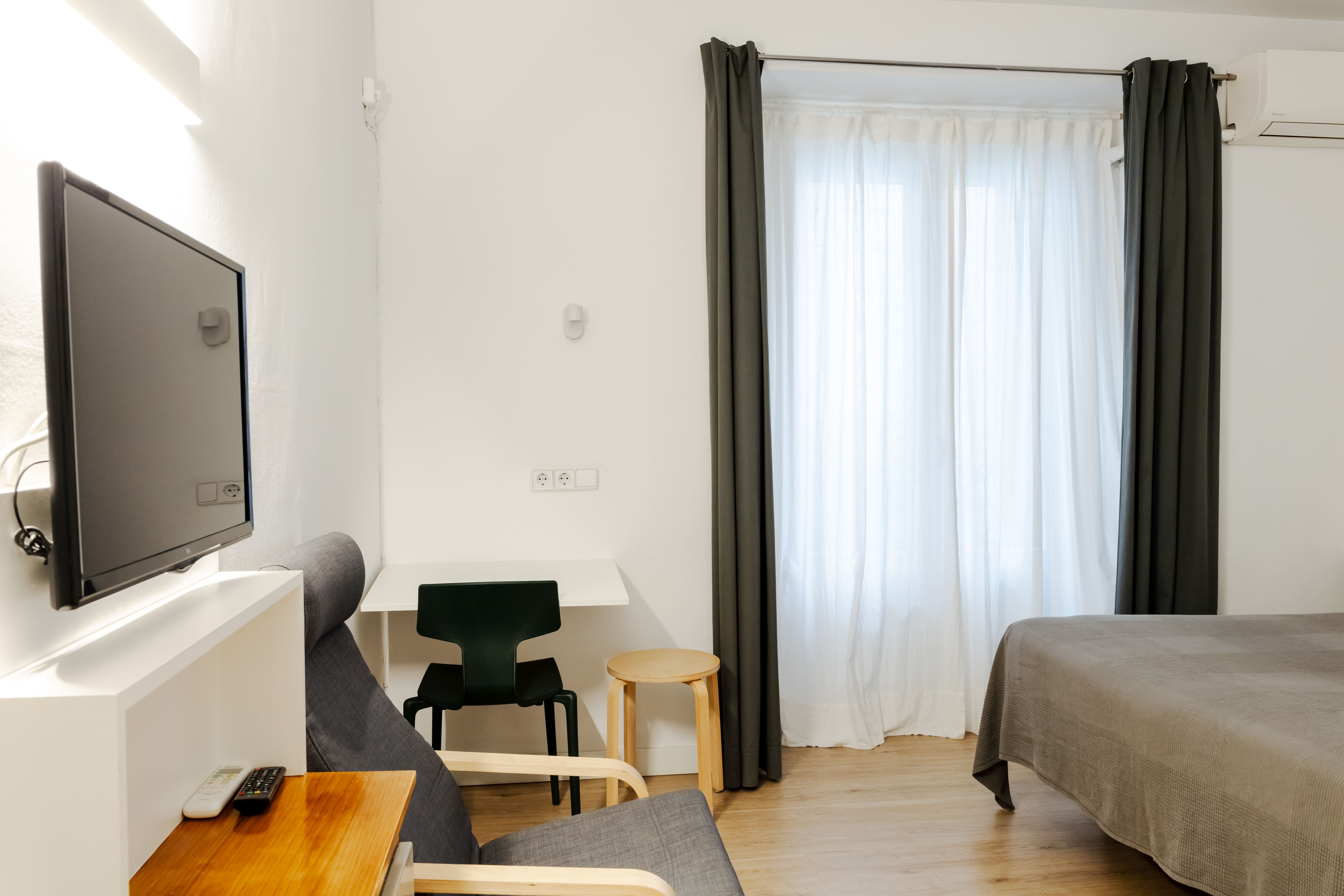 Habitación exterior cómoda y luminosa con cama doble de 180cm. Ofrecemos tarifas para una o dos huéspedes. Tiene baño propio y balcón. Está equipada con mesa, wifi, aire acondicionado individual, calefacción central y TV.