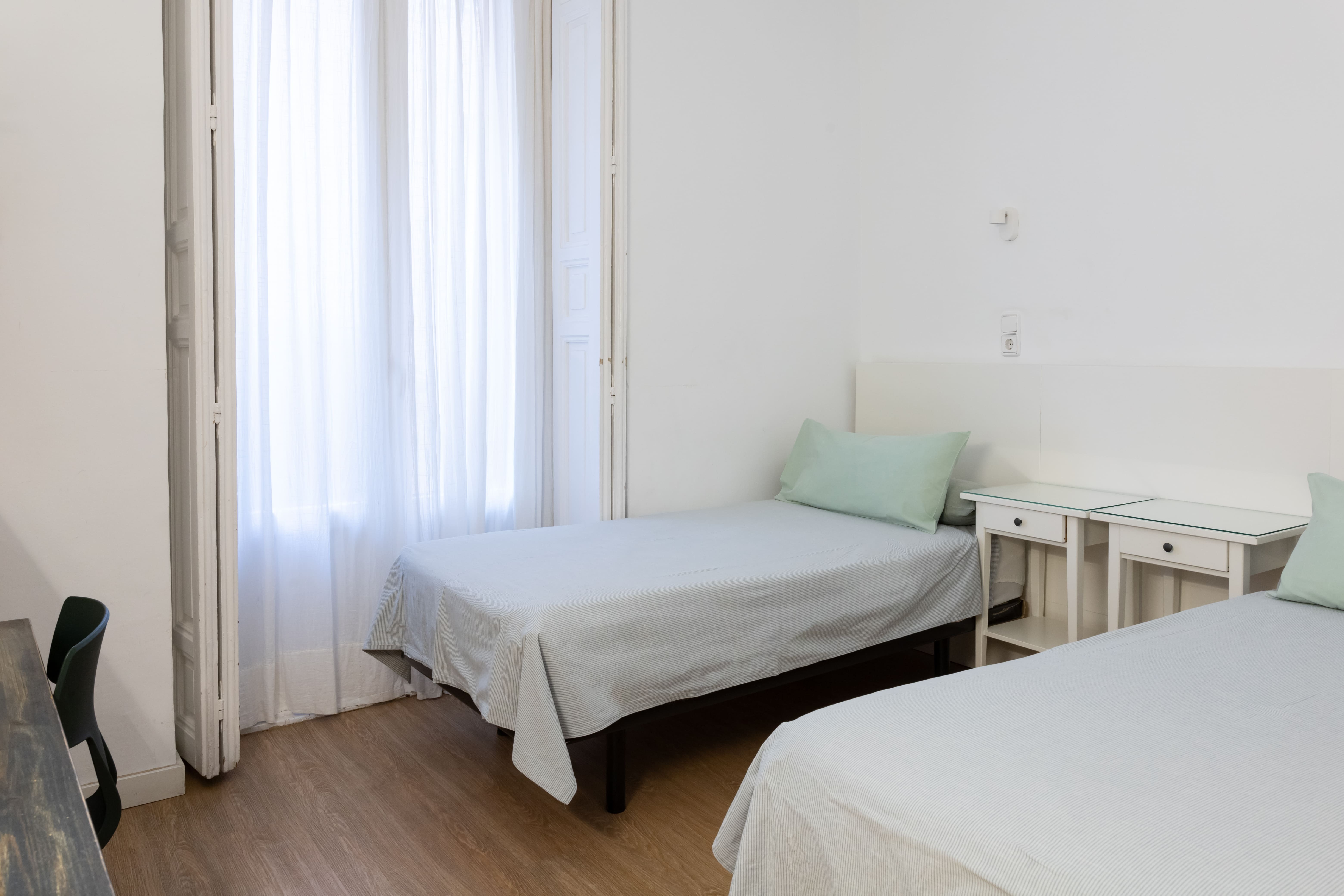 Habitación exterior cómoda y luminosa con dos camas individuales de 90cm. Ofrecemos tarifas para una o dos huéspedes. Tiene baño propio y balcón. Está equipada con mesa, wifi, aire acondicionado individual, calefacción central y TV.
